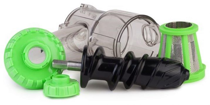 Основная нагрузка по производству сока приходится на прочный и мощный шнек, который представляет собой мощный вал. Способ работы данной категории моделей напоминает мясорубку. За счет специфики механизма, из измельченных частичек продуктов выдавливается сок. Затем все попадает на фильтр и под воздействием вала, измельченный продукт продавливается через фильтр.