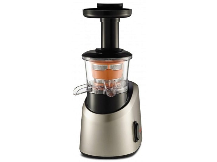 Электродвигатель изделия имеет мощность в 200 Вт и не превышает допустимый уровень шума. В комплект входят два объемных кувшина: для жмыха и напитка. Аппарат быстро разбирается и собирается, не требует особого ухода, прост в обслуживании. Легко моется как руками, так и возможна обработка в посудомоечной машине.