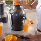 - Полностью автоматизированный процесс. Конечно, некоторые шнековые модели также вполне удачно работают от электросети, однако в их случае необходимо постоянно использование толкателя для продуктов. Центробежные соковыжималки практически лишены этого недостатка, так что достаточно просто засыпать фрукты или овощи в горловину;