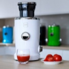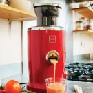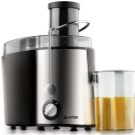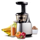 Обладает стандартными функциями, но имеет свои преимущества. В соковыжималку можно погружать фрукты и овощи целиком. Механизм работает на нескольких режимах и способен выжимать сок из твердых овощей. Конструкция зафиксирована на прорезиненных ножках для безопасной фиксации.